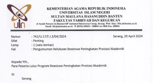 Berdasarkan Keputusan Rektor Universitas Islam Negeri Sultan Maulana Hasanuddin Banten tentang Jadwal Perkuliahan Semester Ganjil Tahun Akademik 2024/2025 Nomor: 1218 Tahun 2024, tanggal 27 Desember 2024, bersama ini kami sampaikan bahwa pelaksanaan Ujian Tengah Semester (UTS) Ganjil Tahun Akademik 2025/2026 dilaksanakan dengan ketentuan sebagai berikut: